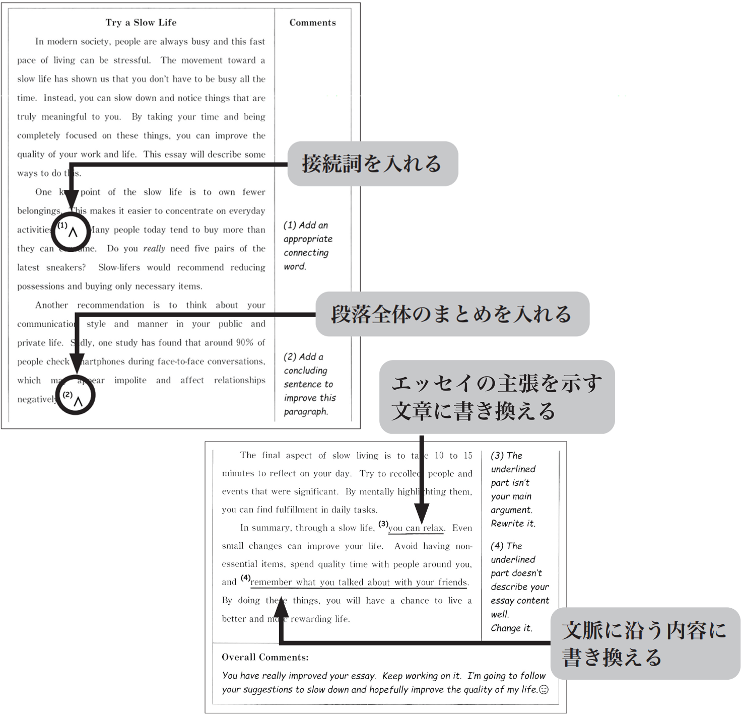 接続語句の補充、適切な内容への書き換え、不足している文の補充など「英文を書くこと」を意識させる問題です。